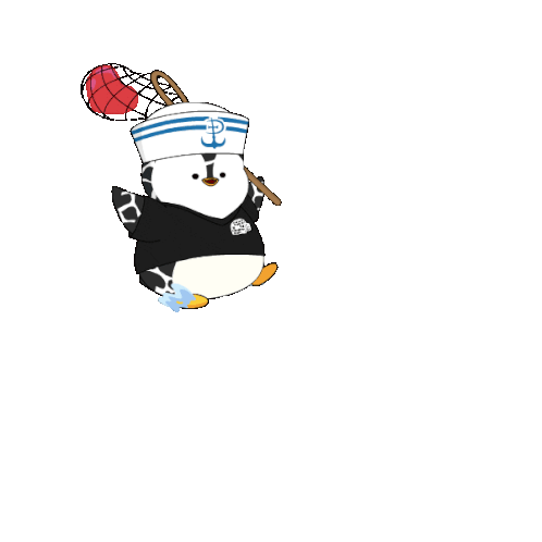 An adorable Pudgy Penguin in a sailor outfit runs with a net, having caught a big red heart, symbolizing stealing hearts.