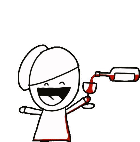 A happy cartoon character joyfully pours red wine from a bottle into a glass, celebrating the love for wine.