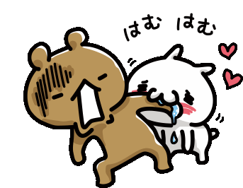 An adorable cartoon bear nibbles on a smaller white creature, with hearts and Japanese text 'hamu hamu' indicating affection.