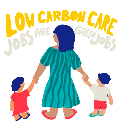 An animated sticker promoting 'Low Carbon Care Jobs Are Green Jobs' with a mother and two children, advocating for climate action.