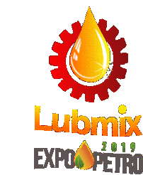Animated logo for Lubmix Expo Petro 2019, featuring a gear and shimmering oil drops, representing fuel and lubricants.
