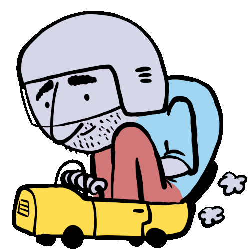 Lucas Levitan's cartoon man with a helmet and beard drives a small yellow go-kart, kicking up dust as he speeds along.