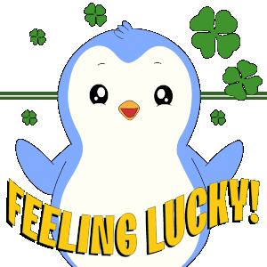 A cute cartoon penguin with a four-leaf clover on its chest, surrounded by clovers and 'FEELING LUCKY!' text.