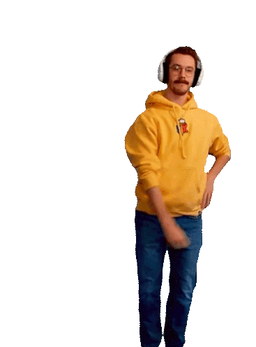 a man wearing headphones and a yellow hoodie with a cartoon character on it