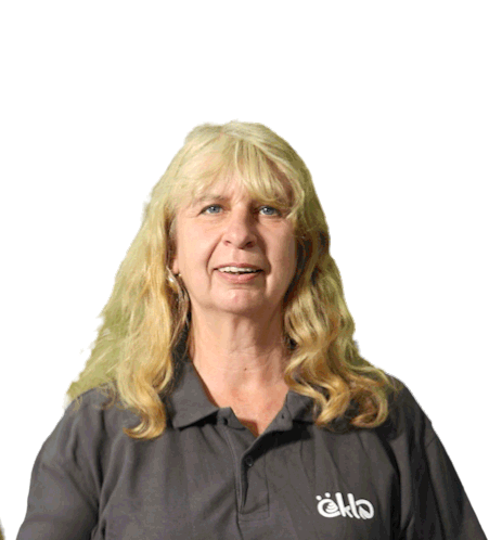 Ludmila, a blonde woman, smiles and points her right index finger to the right, wearing an "öklo" polo shirt.