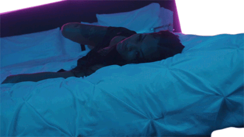 Ann Marie lies on a bed under blue lighting, gazing thoughtfully. A serene and slightly melancholic moment.