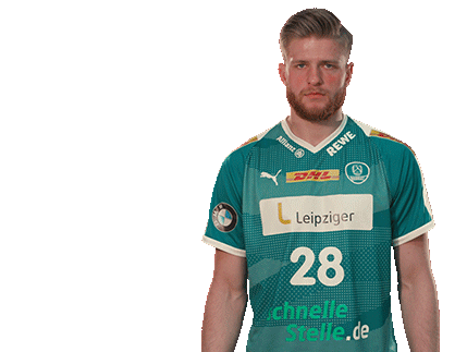 Maciej Gębala, the 'Diewand' handball player, in his green Leipzig jersey, raises his fists in a determined and ready pose.