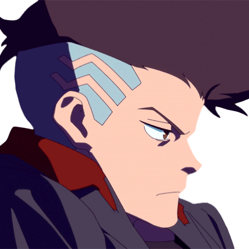 David Martinez from Cyberpunk Edgerunners looks mad and upset, with a frowning expression. An animated sticker.
