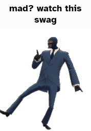 The TF2 Spy character performs the Conga dance with the text "mad? watch this swag", showcasing his cool moves.