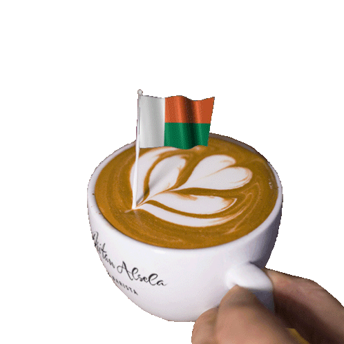 A hand holds a coffee cup featuring beautiful latte art and a small flag of Madagascar, with 'Dritan Alsela' on the cup.