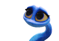 Maddie The Snake, a blue animated character, is shown with a sad and expressive face, blinking slowly.