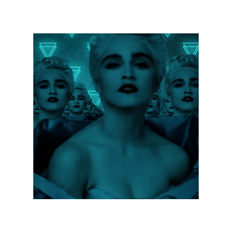 An animated sticker featuring a rotating 3D cube with multiple images of pop icon Madonna, set against a futuristic background with glowing triangles.