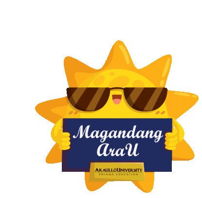 A cheerful sun character wearing sunglasses holds a sign that says 'Magandang Arau' for Araullo University.