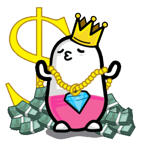 A cute, pill-shaped character with a pink bottom and kissing lips is surrounded by falling stacks of green money, celebrating wealth.