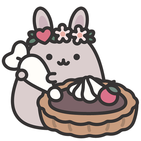 a cartoon drawing of a bunny holding a pie with strawberries on it