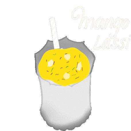 A cartoon drawing of a vibrant yellow mango lassi in a cup with a straw, perfect for a refreshing treat.