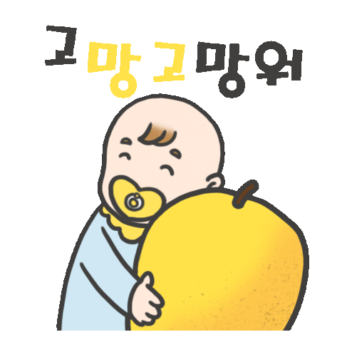 A cute baby character with a pacifier hugs a large yellow mango, expressing "Thank you" in Korean.