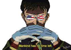 Gendo Ikari from Evangelion, with American flag glasses, states 'Mankind has no time left' in this intense sticker.