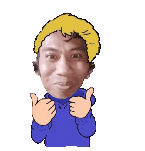 A person with a cartoon body and real face gives two thumbs up, with the word 'Mantap' visible, expressing approval.