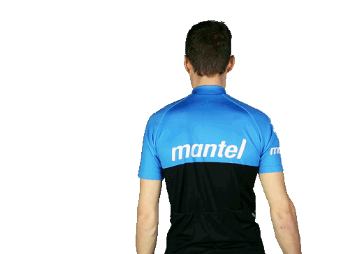 A male cyclist wearing a blue and black Mantel jersey celebrates with a triumphant pose, perfect for sports and cycling enthusiasts.