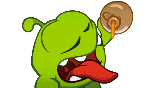Om Nom from Cut the Rope eagerly catches dripping maple syrup or honey in its wide-open mouth, looking delighted.
