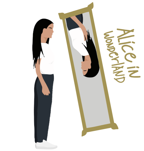 Marina Lin looks into a mirror, seeing her reflection upside down in an Alice in Wonderland theme.