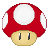 A classic pixel art red mushroom with white spots and a beige stem, featuring two small black eyes, from the Super Mario Bros. game.