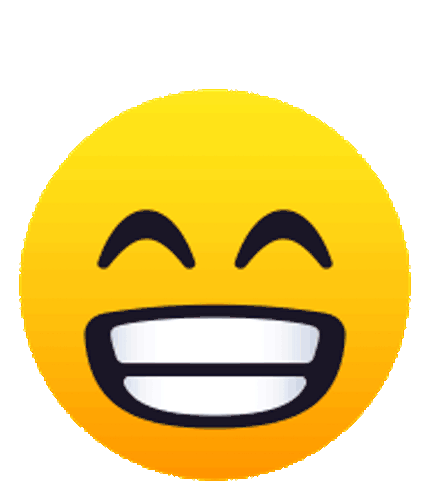 A bright yellow laughing emoji with a wide open mouth and white teeth, animated with a sparkling effect on one tooth.