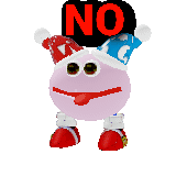Marx Kirby, the jester character, emphatically says 'NO' with a red tongue sticking out, wearing a festive hat.