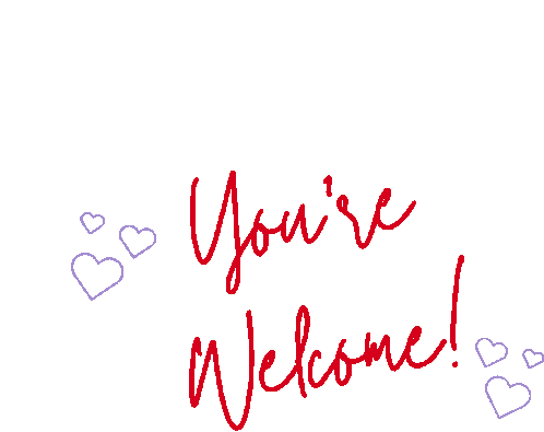 A friendly 'You're Welcome!' message in red script, adorned with purple hearts, associated with Mary Kay.
