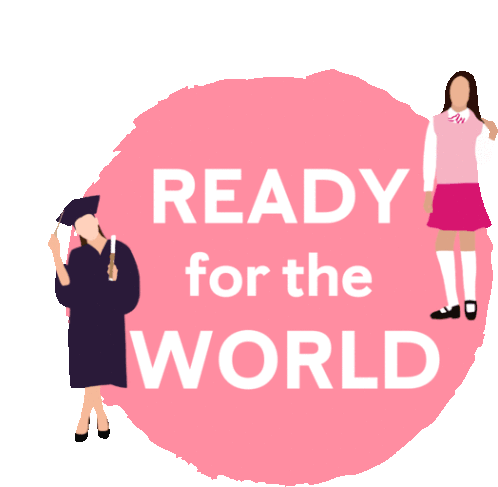 A Mary Kay sticker featuring a graduate in cap and gown and a student, with the empowering message 'READY for the WORLD' on a pink background.