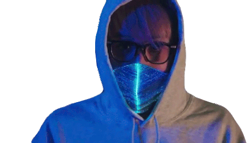 Roguegg, wearing glasses and a hoodie, removes a glowing blue mask, revealing a serious, direct stare.