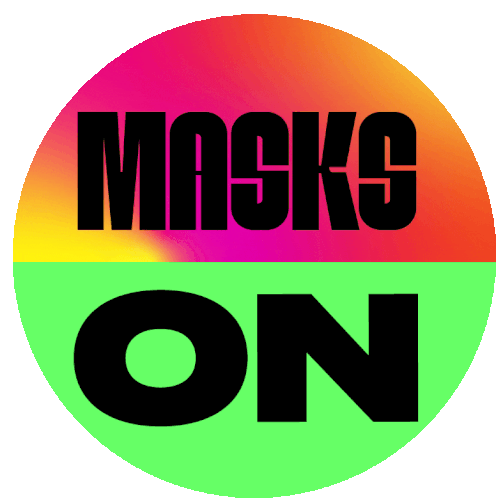 An animated circular logo featuring 'MASKS ON' text, with the bottom half's background and 'ON' text color changing dynamically.