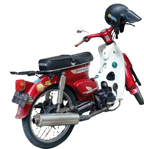 a red and white honda motorcycle with a helmet on top