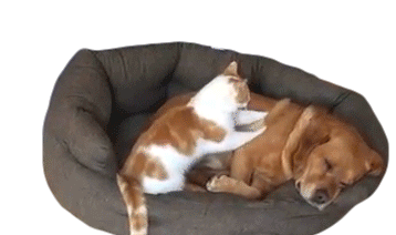 An adorable orange and white cat gently massages a sleeping golden retriever dog in a cozy pet bed.