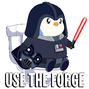 A cute penguin dressed as Darth Vader sits on a toilet, holding a lightsaber, with the caption "USE THE FORCE."