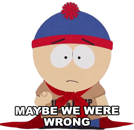 Stan Marsh from South Park, wearing a red cape, looks concerned and says 'Maybe we were wrong,' expressing doubt or regret.