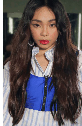Maymay Entrata, a model with long wavy hair, poses confidently, looking pretty and sassy in a striped shirt and blue top.