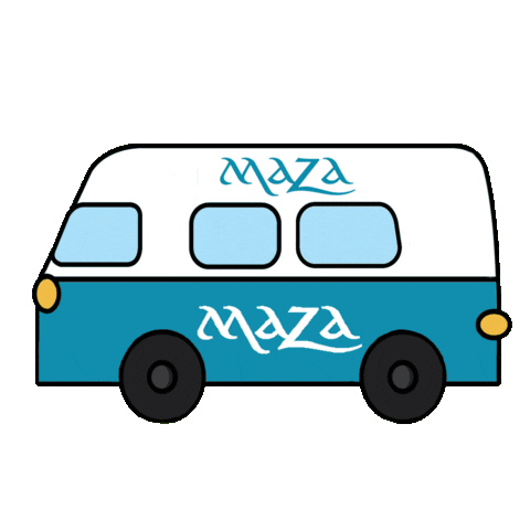 a cartoon drawing of a blue and white bus that says maza on the side