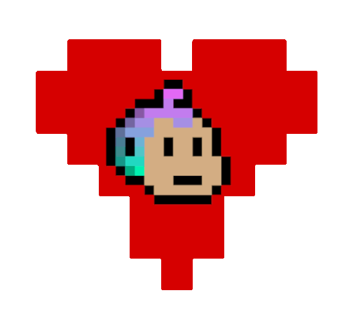 A pixel art heart with the Monkey Baby Business character's head inside, featuring colorful hair.