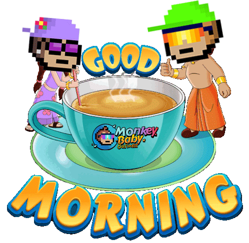 An animated Good Morning sticker featuring two pixelated characters, a steaming cup of coffee, and the 'Monkey Baby Business' logo.