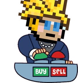 Mbb Monkey, the Monkey Baby Business character, holds a 'buy' button in this pixel art sticker, perfect for shopping sprees.
