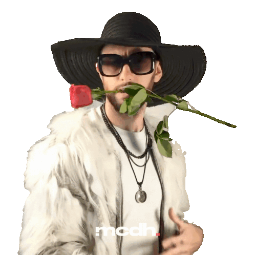a man wearing a hat and sunglasses is holding a rose in his mouth and the word mcdh is on the bottom