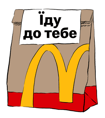 McDonald's delivery bag with "їду до тебе" (I'm coming to you) in Ukrainian, signaling food is on its way.