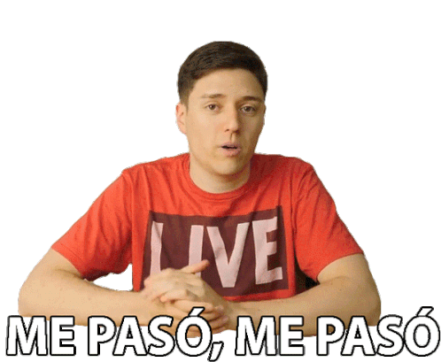 A man in a red shirt shrugs with open hands, expressing 'Me Pasó, Me Pasó' (It happened to me).