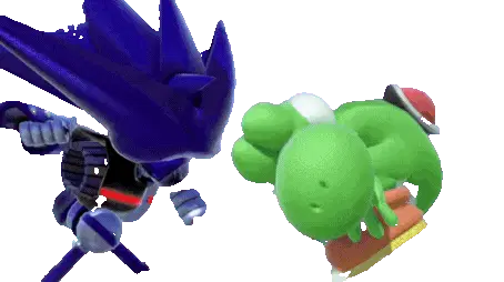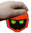 An animated sticker of a Mecha Brawlers cartoon character with green eyes, held by a hand, blinking on a white background.