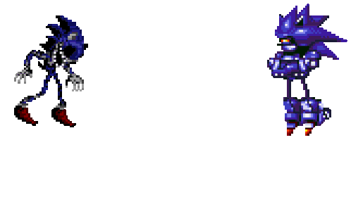 Faker, a skeletal Sonic-like character, battles Metal Sonic in a pixel art animation, defeating him with an energy attack.