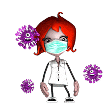 Medatixx Roxy, a cartoon character, wears a medical mask while surrounded by purple viruses, emphasizing caution and protection.