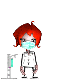 Medatixx Roxy, a cartoon character, sanitizes her hands to fight off a purple virus, promoting hygiene and safety during the pandemic.