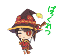 Chibi Megumin from Kono Suba sings happily with a musical note, featuring Japanese text 'Bakkuu'.